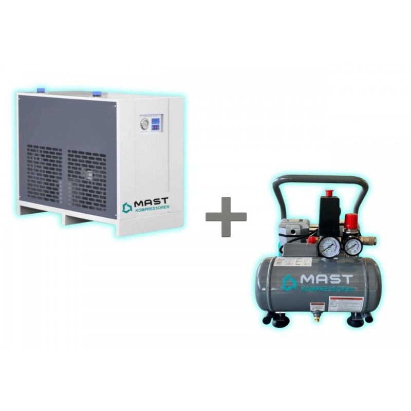 Два товари за ціною одного: при купівлі осушувача (арт. SHB-30) ви отримуєте компресор (арт. MOF1390/1100 compact) у подарунок! Осушувач Mast SHB-30 (10 Бар) Рефрижераторний осушувач Mast SHB-30 призначений для очищення стисненого повітря від вологи та мастильних домішок. Завдяки продуктивності 3600 л/хв і робочому тиску 10 Бар він сумісний з більшістю промислових компресорів. Точка роси: 2–10℃ Автоматичний клапан для зливу конденсату з регулюванням Сталевий корпус з порошковим покриттям Низький рівень шуму Переваги: захист обладнання від корозії, просте підключення, надійна робота у виробничих умовах. Компресор Mast MOF1390/1100 compact Компактний безмасляний компресор для завдань, де потрібне чисте повітря: фарбування, аерографія, продувка, шиномонтаж. Продуктивність: 175 л/хв Робочий тиск: 8 Бар Потужність двигуна: 800/1100 Вт Об’єм ресивера: 5 л Час наповнення: 21 с Вага: 12 кг Переваги: мобільність, низький рівень шуму, відсутність потреби у мастилі, захист від перегріву. Комплексне рішення Поєднання компресора Mast MOF1390/1100 compact та осушувача Mast SHB-30 забезпечує стабільну подачу сухого й чистого повітря для промислових і виробничих процесів.
