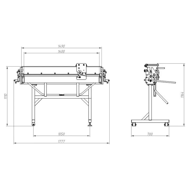 Комплект поставки ручного листогиба (стандартная комплектация) : листогибочный станок рг днепр длиной 1400мм, нож отрезной роликовый, угломер, ограничитель для угломера, приемный стол с фиксаторами.