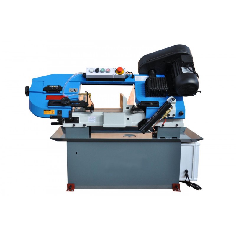 Полотно висотою 20мм: Полотно 20мм забезпечує гарну геометрію різу, оскільки полотно непогано тримає саме себе в різі. Порівняно з 13-м полотном має кращий ресурс та стабільність при роботі. Дана стрічка як правило використовується для різки чорних металів, оскільки для нержавіючих та інших важких для пропилу металів 20-те полотно важче найти на ринку. 20-те полотно, порівняно з 13-м, завдяки більшій висоті має більшу площу охолодження від системи ЗОР, що буде великою перевагою при довготривалій роботі чи різці суцільно-металевих заготовок або пакетній різці. Наявність ЗОР: Для підвищення ефективності роботи верстату встановлений ЗОР. ЗОР – це змащувальна-охолоджувальна рідина, яка відповідає за охолодження полотна, що допомагає уникнути перегріву і відповідно розтягування та спадання його з шківів, збільшує термін служби полотна, оскільки при нагріві, підвищена температура негативно впливає на твердість зубів полотна і пришвидшеного їх затуплення. Охолодження дозволяє працювати при вищих швидкостях полотна без його перегріву, що покращує продуктивність та ефективність різання. Гідроциліндр: Гідроциліндр, який використовується для опускання голови стрічкової пили, забезпечує плавне та контрольоване опускання, що дозволяє точно контролювати процес різання. Також гідроциліндр дозволяє зафіксувати ріжучу голову на довільній зручній для конкретної заготовки висоті, щоб початок опускання голови відбувався безпосередньо над заготовкою, а не від крайнього верхнього положення Різ під кутами: Здатність різати під кутами є незамінною функцією верстату, дана модель обладнана поворотними тисками. Завдяки простоті конструкції має доступнішу ціну порівняно з пилами з поворотною ріжучою головою. Використовується на виробництвах, де виконується різ як правило під прямим кутом і іноді під іншими кутами. Дротяна щітка: Стрічкова пила обладнана дротяною щіткою яка очищує полотно, дозволяє уникнути накопичення стружки та інших відходів на шківах. Стружка на шківах вкрай негативно буде впливати на точність вертикального різу, наявності зайвих шумів і нерівномірний натяг полотна. Чисте полотно забезпечує кращий контакт з матеріалом, також очищене полотно вимагає менше енергії для різання, що може зменшити навантаження на двигун та інші механізми пилки. Безпека понад – усе! Запобіжні пристрої в стрічкових пилах для металу є важливою частиною системи безпеки та призначені для захисту оператора та самого обладнання від небезпек та непередбачених ситуацій. Система автоматичного вимикання після закінчення різу заготовки, виконується за допомогою кінцевого вимикача. Це вимоги згідно європейських норм безпеки для працюючого персоналу. Також присутні аварійні вимкнення при виявленні небезпечних умов, таких як перегрів, перевантаження чи інші аварійні ситуації.