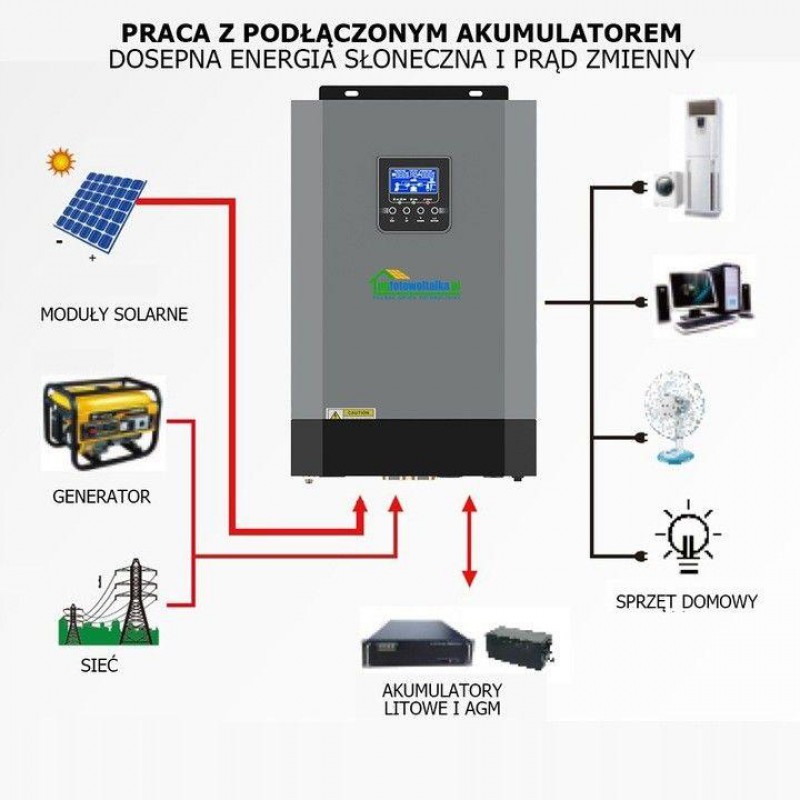 Технические данные Режим сети Форма входного напряжения - синусоида (от сети или генератора) Номинальное входное напряжение - 230V AC Низкое напряжение отключения - 170 В переменного тока (ИБП), 90 В переменного тока (типовые электрические устройства) Максимальное входное переменное напряжение - 300 В переменного тока Номинальная входная частота - 50 Гц / 60 Гц (автоматическое определение) Защита выхода от короткого замыкания - режим сети: защита от перегрузки по току; режим работы от батареи: электронная защита Время переключения - 10 мс (типовой ИБП); 20 мс (типовой - электрические устройства) Уменьшение выходной мощности - когда входное напряжение падает ниже 170 В переменного тока, выходная мощность ограничивается Инверторный режим Номинальная выходная мощность - 5,5 кВА / 5,5 кВт - 5500 Вт Форма входного напряжения - чистая синусоида Номинальное выходное напряжение - 230В±5% Выходная частота - 50 Гц Пиковый КПД - 94% Мгновенная пиковая мощность - 2x номинальная мощность в течение 5 с - 11000 Вт Номинальное входное напряжение - 48 В постоянного тока Напряжение постоянного тока при холодном запуске - 48 В постоянного тока Собственное потребление - <50 Вт Собственное потребление в режиме "экономии" - приблизно 15 Вт Режим зарядки (зарядное устройство) Ток зарядки (UPS) - 80 A - регулируется Напряжение зарядки "BULK" - 58,4 В постоянного тока (залитые батареи); 56,4 В постоянного тока (герметичный, AGM, GEL) Напряжение зарядки в режиме ожидания 54 В постоянного тока Режим солнечной зарядки PWM Максимальный ток зарядки - 110 А Напряжение открытия струны Voc - 500 В постоянного тока макс Диапазон напряжений - Начальное напряжение инвертора - 30~32 В постоянного тока Напряжение постоянного тока - 17 В Собственные потери (на опережение) - 2 Вт Максимальное напряжение солнечных панелей (VOC): 500 В постоянного тока (обратите внимание, сколько панелей будет подключено) Степень защиты: IP21 Диапазон рабочих температур: 0-55°C Класс защиты: I класс Гарантия: 2 года Размеры - 47,2х29,7х13,3 см Вес - 10,7 кг Интервалы передачи данных 5 минут Функции и преимущества Многофункциональность: работает как инвертор переменного тока и зарядное устройство постоянного тока, объединяет функции сетевого зарядного устройства 230 В и солнечного контроллера заряда Гибкость в использовании: инвертор можно подключить к сети или генератору энергии для зарядки аккумуляторов или питания устройств Поддержка батарей: необходим аккумулятор для работы; минимальное напряжение для запуска - 20 В (от аккумулятора) и 30 В (от панелей) Интеллектуальный заряд: автоматический перезапуск после восстановления напряжения, защита от перезаряда, перегрева, короткого замыкания, интеллектуальный режим зарядки для длительной работы ШИМ-контроллер: эффективно заряжает аккумулятор, защита от всплесков, короткого замыкания, перегрузки, обратной полярности Подключение: может работать без подключения к сети, от аккумуляторов и фотоэлектрических панелей WiFi: встроенный модуль WiFi для дистанционного мониторинга через приложение для смартфона Приложение: мобильное приложение позволяет измерять сбережения и контролировать работу системы Использование: использование Питание домашних и других устройств: офисное оборудование, осветительное оборудование, оборудование с электродвигателями (вентиляторы, кондиционеры, стиральные машины, посудомоечные машины и т.