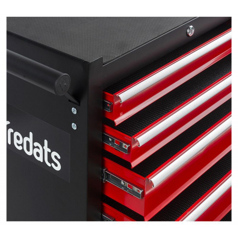 Візок для інструменту REDATS COMPACT Black з компактною конструкцією і 7 місткими шухлядами відмінно підходить навіть для невеликих майстерень. Шухляди різного розміру дозволяють посортувати інструмент по групах для зручної організації, зберігання та переміщення. Максимальне навантаження на 2 верхні шухляди - 10 кг кожна, на 5 нижніх шухляд - до 15 кг кожна. Напрямні на підшипниках забезпечують плавне та легке висування/засування шухляд навіть при повному завантаженні. Верхня стільниця має вантажопідйомність 90 кг і може використовуватися для зберігання важких інструментів або як робоче місце. Розмір 2 верхніх шухляд становить 511х278х 54 мм, 5 нижніх шухляд - 511х278х84 мм. Кожна шухляда має поролонову підкладку для запобіганню ковзанню інструменту при переміщенні. 4 міцних колеса, 2 з яких поворотні, дозволяють легко переміщати цей візок з висувними шухлядами по майстерні, а гальмо на одному колесі - надійно зафіксувати його на місці. Візок поставляється без інструменту! Особливості візка для інструменту REDATS COMPACT Black Без інструменту 7 висувних шухляд на підшипникових направляючих Розмір 2 верхніх шухляд - 511х278х 54 мм, вантажопідйомність - 10 кг кожна Розмір 5 нижніх шухляд - 511х278х84 мм, вантажопідйомність - 15 кг кожна Поролонові підкладки в усіх шухлядах Центральний замок для одночасного блокування всіх шухляд Простора верхня стільниця з вантажопідйомністю 90 кг 4 міцних колеса (2 поворотні) Гальмо на одному колесі Компактна конструкція з високоякісних матеріалів Вага - 24,7 кг. Часті запитання Більше корисної інформації про візки для інструменту, їх вибір та вимоги до них - у відповідях на популярні запитання. З якого матеріалу роблять візки для інструменту? Якісні візки для інструменту зазвичай виготовляються зі сталі з порошковим покриттям. Бюджетні моделі можуть бути з пластику, але вони менш довговічні. Для інтенсивного використання рекомендовано обирати візки зі сталевим корпусом товщиною ≥ 0,8 мм. Яке навантаження витримує стандартний візок для інструменту? Стандартні моделі витримують 100-250 кг загального навантаження, а кожна шухляда — до 25-40 кг. Професійні моделі можуть витримувати до 500 кг. Які існують види візків для інструменту? Візки для інструменту можна класифікувати за кількома ознаками: Кількість і тип місць для зберігання - з шухлядами та з відкидними полицями/дверцятами Матеріал - сталеві та пластикові Оснащення - порожні та комплектовані Призначення - універсальні та спеціалізовані. Яким вимогам повинен відповідати професійний візок для інструменту? Професійні візки для інструменту мають відповідати таким вимогам: Висока міцність та надійність Висока вантажопідйомність шухляд Плавне повне висування шухляд Надійний механізм блокування шухляд Якісні колеса з надійними гальмами Надійна система центрального замка Стійкість до агресивного середовища. За якими критеріями обирати візок для інструменту? Щоб зробити правильний вибір, варто врахувати кілька ключових критеріїв: Кількість та розмір шухляд Тип і якість напрямних шухляд Матеріал корпусу Матеріал, діаметр і якість коліс Наявність гальма Наявність центрального замка і механізму блокування шухляд Наявність міцної, зносостійкої стільниці.